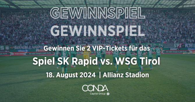 Gewinnen Sie 2 von 4 exklusiven VIP-Tickets für das SK Rapid vs. WSG Tirol im Allianz Stadion am 18. August 2024!   Grün- weißes Ambiente, einzigartige Atmosphäre und hervorragendes Catering: Mit Ihrem VIP-Ticket erleben Sie die Heimspiele des SK Rapid so komfortabel und hautnah wie noch nie. Sie können sich auf erstklassiges Catering, ein spannendes